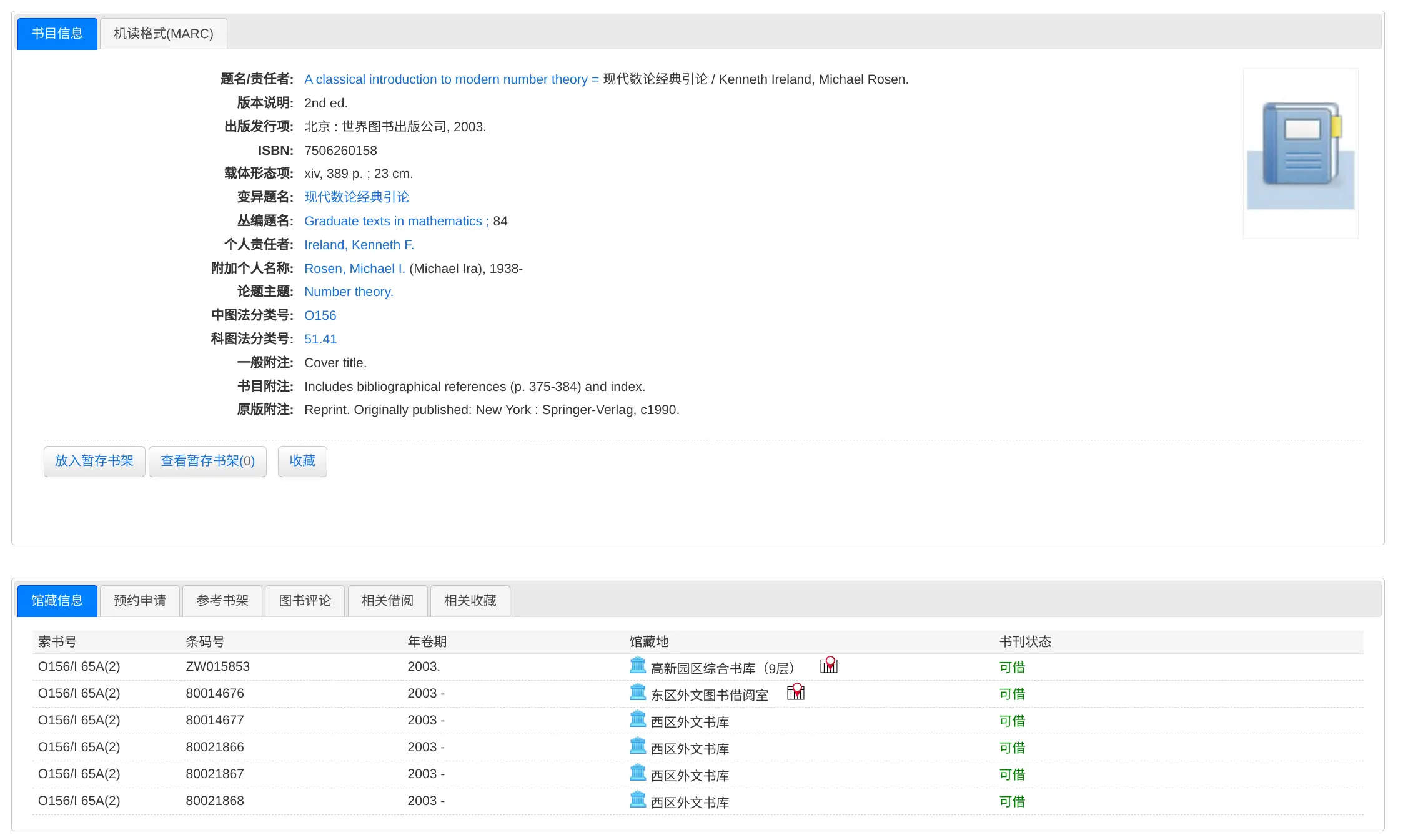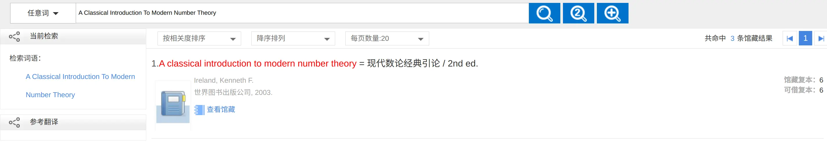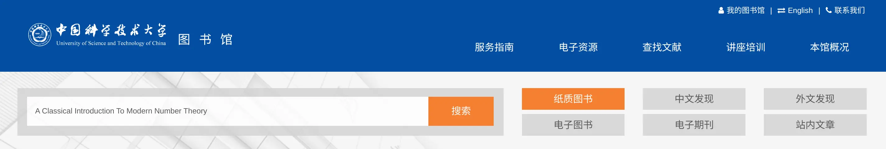 接下来便是要利用官网的检索系统进行书籍检索了,但是搜索的时候不能直接复制粘贴(因为有可能图书的命名不太一样),通过检索关键词 A Classical Introduction To Modern Number Theory 便能检索到该书籍在中科大图书馆的分类及编号。