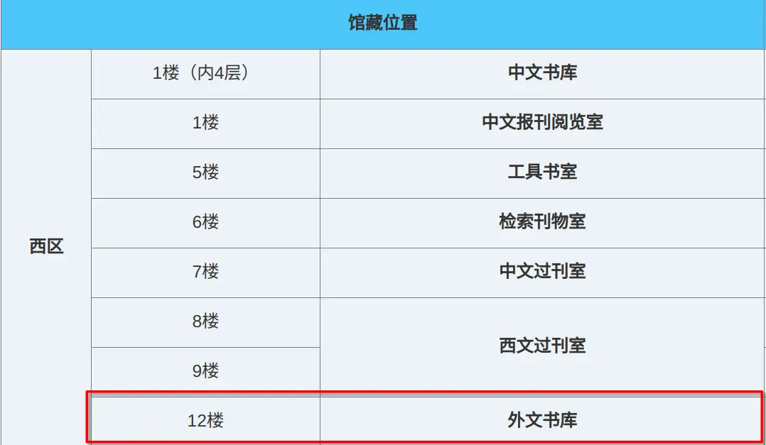 返回到主页,可以注意到导航栏 本馆概况 下有栏目 馆藏分布,在里面便能轻松找到 西区外文书库 的楼层为 12 楼。