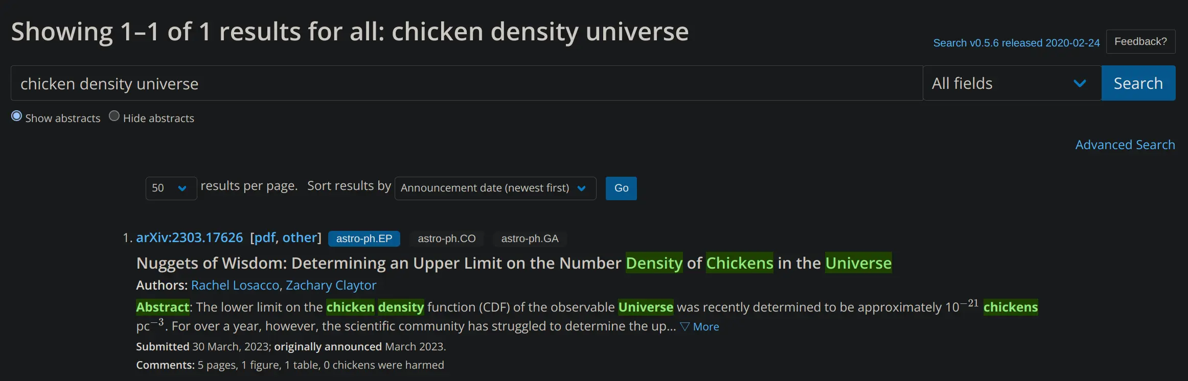 进入 arXiv 后,检索 可观测宇宙中的鸡的密度上限 论文,但显然不能直接搜索中文,于是我利用我贫穷的英语知识大概提炼了一下关键词 chicken density universe,于是搜索到了题为 Nuggets of Wisdom: Determining an Upper Limit on the Number Density of Chickens in the Universe 的论文。