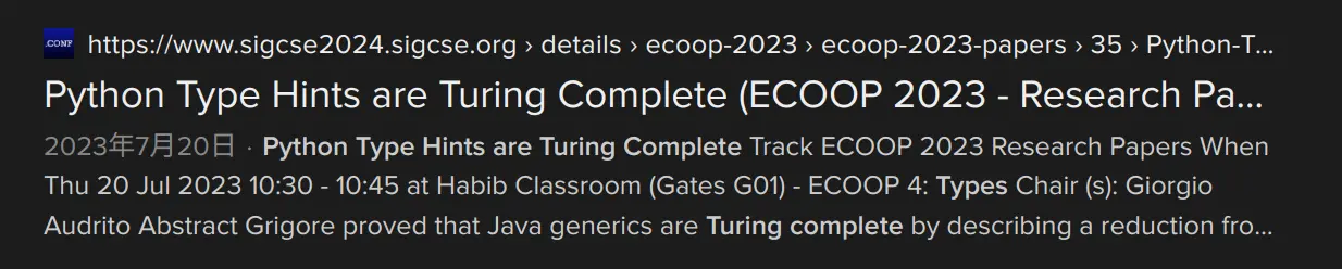 提炼关键词 Python 类型检查 停机问题 (python type checking halting problem),最终可以定位到一篇名为 Python type hints are Turing complete 的论文。