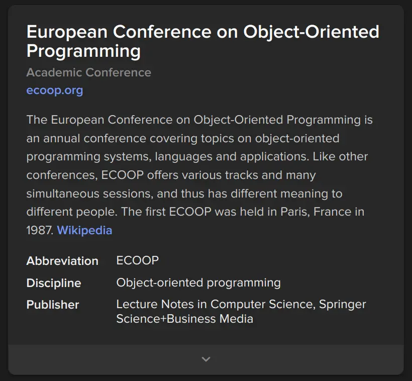 再以论文标题作为检索词扔进搜索引擎搜索,最终可定位到这篇论文与 ECOOP 2023 相关,再进一步资料搜索,可以了解到 ECOOP 全名 European Conference on Object-Oriented Programming,可确定这是一场学术会议。