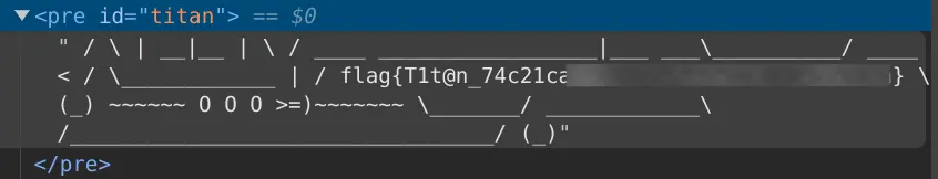 这道题只要通过审查元素/检查功能,根据题目说的,找到最底下的元素 id 为 titan 残骸,把它展开就能看到 flag 了。