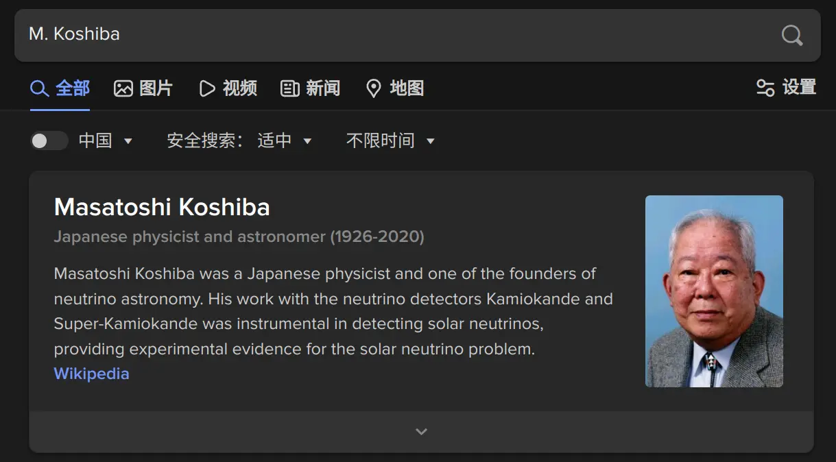 通过 Google Lens 等识图技术,或者将奖牌四周的文字一检索可以很快地找到这是一个诺贝尔奖牌,同时也能看到获奖人为 M. KOSHIBA。