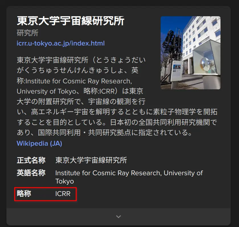 经过对比可以看到出生最晚者名为 梶田隆章(Takaaki Kajita),从介绍中可看到其身份为 宇宙線研究所教授。通过检索 東京大学宇宙線研究所,不难找到它的简称为 ICRR。