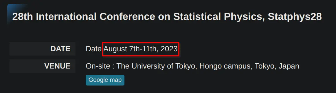 进入 STATPHYS28 官网 可以看到活动时间为 August 7th-11th, 2023。