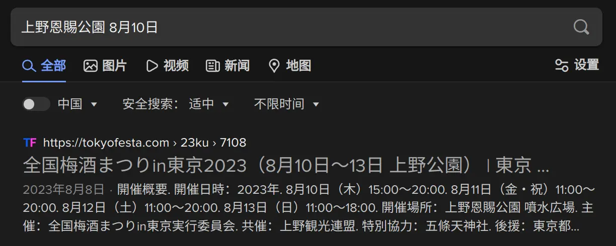 后面就以 上野恩賜公園 8月10日 作为关键词进行检索,便找到了 全国梅酒まつりin東京2023 的活动。
