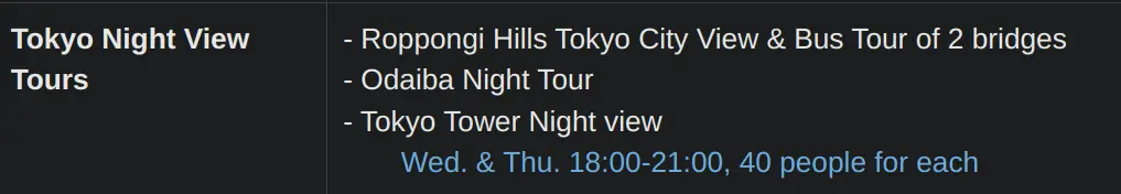 但发现符合条件的只有 Tokyo Night View Tours 活动,所述内容并不符合题目所说的 乘船欣赏东京的迷人夜景。