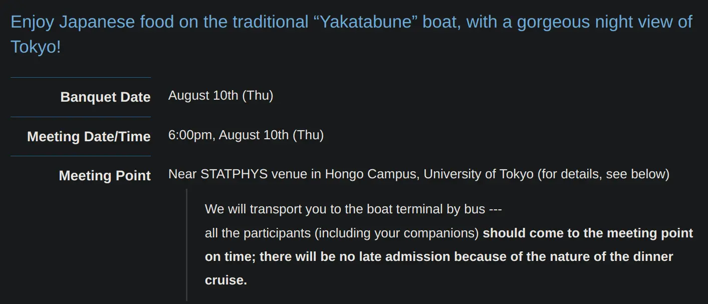 根据文字描述 学长那天晚上将继续他的学术之旅,打算乘船欣赏东京的迷人夜景和闪耀的彩虹大桥(Rainbow Bridge),结合上面分析到学长很可能参与的 STATPHYS28 活动,再次进入 STATPHYS28 官网了解详情。