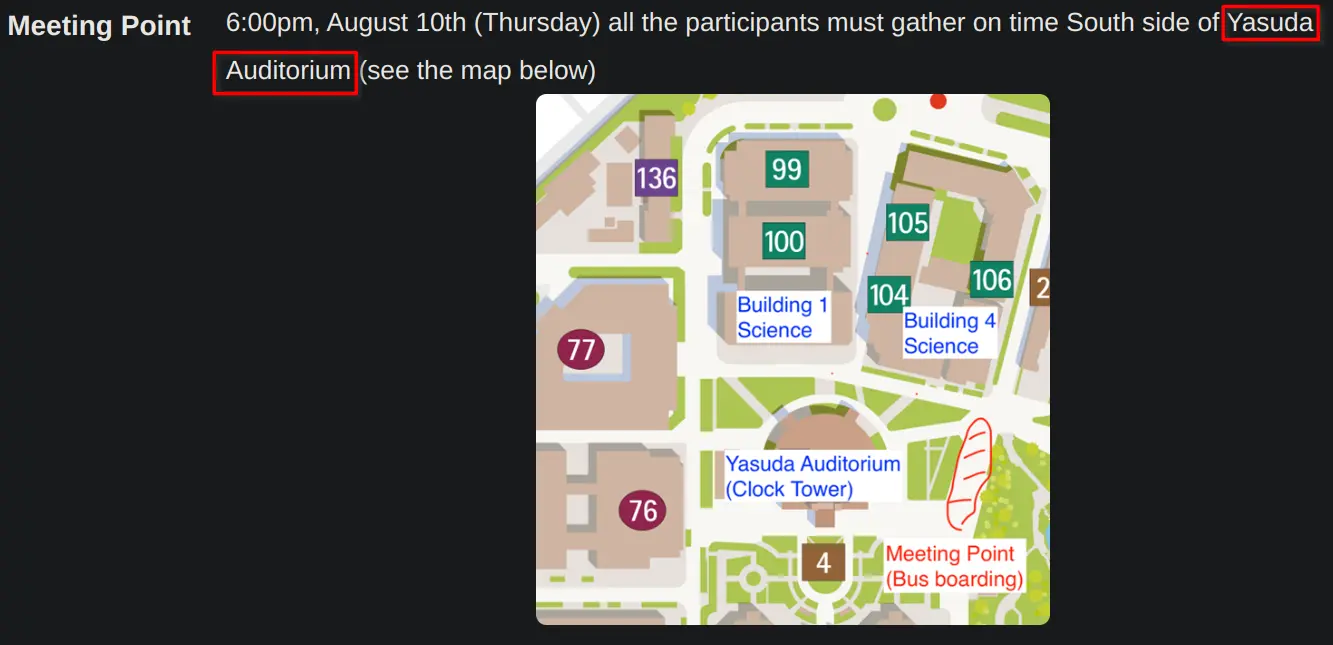 也在底部的 Meeting Point 一栏找到了集合点 Yasuda Auditorium。