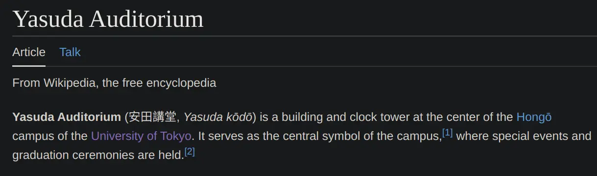 经过简单的检索,可以了解到该地点中文名为 安田讲堂。